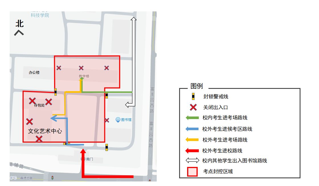 校外考生从学院南门进出,考试当天7:00、12:00开始允许考生本人进入。南门设置两条核验通道,由工作人员验证考生准考证和身份证无误后进入校园。校内考生从学院图书馆北侧通道进入考场楼入口,工作人员核验准考证和身份证无误后方可通行。